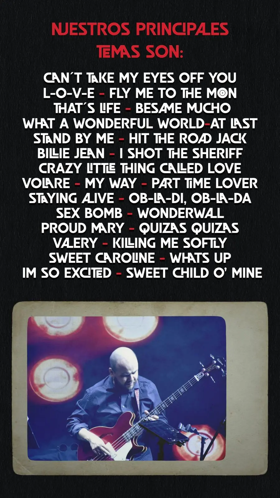 En este mini concierto puedes ver un resumen de lo que es nuestro show. Todo está grabado a una toma sin ediciones de audio. Como lo escuchas es como suena en vivo. https://youtu.be/oMrrtn7NfWU?si=11U-JVfczByxLOAxhttps://youtu.be/Z_UAIXvaBO4?si=3xOwJzfOgQ5t-mFfhttps://youtu.be/8ICuH3fmbUU?si=cRjZVIAIp2J_evZZhttps://youtu.be/R_syId-c1kY?si=q5Zwt8AJ-MlNPBGmhttps://youtu.be/_xerc6lLXUs?si=5xzgnDd_klUiUjRdhttps://youtu.be/RJLhQcOercM?si=Kp0QFYinXLz-rQMAhttps://youtu.be/hYXR0j2a3Uo?si=8cpHVA5dPRbEbJquhttps://youtu.be/-vTVJtZ6dbQhttps://youtu.be/jgtKrWOp4aUhttps://youtu.be/B46miapx57Qhttps://youtu.be/XIguipK12Ikhttps://youtu.be/gZguFXRgNPshttps://youtu.be/iodDQWFIQ-ghttps://youtu.be/iia_yoZYx1k